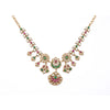 Add a royal touch to your traditional look with this beautifully crafted Kundan & Ruby Necklace Set. Featuring intricate floral motifs adorned with green kundan stones, ruby-red accents, and sparkling CZ embellishments, this necklace radiates elegance. Its symmetrical design with delicate drop detailing enhances bridal and festive outfits, while the matching earrings complete the regal set.
