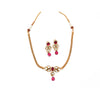 Grace your look with this elegant Ruby & Kundan Necklace Set, crafted with a sleek gold-plated chain and a delicate centerpiece. The design features lustrous kundan stones paired with ruby-red embellishments and a drop pendant for a sophisticated finish. The matching earrings mirror the same regal charm, making this set perfect for festive occasions, and traditional celebrations.