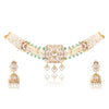 The choker is paired with matching jhumka-style earrings, detailed with kundan work and finished with gentle pearl drops that sway gracefully as you move. Elegant rather than heavy, this set is ideal for weddings, engagement ceremonies, festive celebrations, and intimate traditional occasions. It pairs wonderfully with silk sarees, pastel lehengas, and classic anarkalis, creating a look that feels timeless, polished, and effortlessly regal.